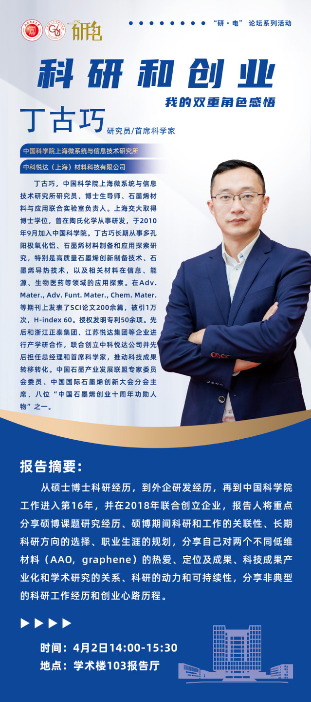主讲人简介:丁古巧,中国科公司上海微系统与信息技术研究所研究员、博士生导师、石墨烯材料与应用联合实验室负责人。上海交大取得博士学位,曾在陶氏化学从事研发,于2010年9月加入中国科公司。丁古巧长期从事多孔阳极氧化铝、石墨烯材料制备和应用探索研究,特别是高质量石墨烯创新制备技术、石墨烯导热技术,以及相关材料在信息、能源、生物医药等领域的应用探索。在Adv. Mater., Adv. Funt. Mater., Chem. Mater.等期刊上发表了SCI论文200余篇,被引1万次,H-index 60。授权发明专利50余项。先后和浙江正泰集团、江苏悦达集团等企业进行产学研合作,联合创立中科悦达公司并先后担任总经理和首席科学家,推动科技成果转移转化。中国石墨产业发展联盟专家委员会委员、中国国际石墨烯创新大会分会主席、八位“中国石墨烯创业十周年功勋人物”之一。