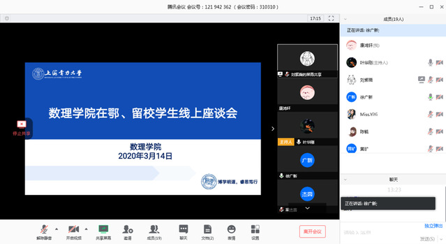 参加座谈同学感谢公司领导、老师的关心,听到老师说“我们虽然身处不同的地方,但我们都有一个共同的名字——’上电人’、‘数理人’”、“公司、公司就是你们的大后方”时,真切地感受到来自公司和公司的温暖,“没有一个冬天不可逾越,没有一个春天不会来临”,坚信在党和国家的领导下,一定能够打赢这场疫情防控阻击战,期盼能够早日回到校园,和老师同学们的相逢!