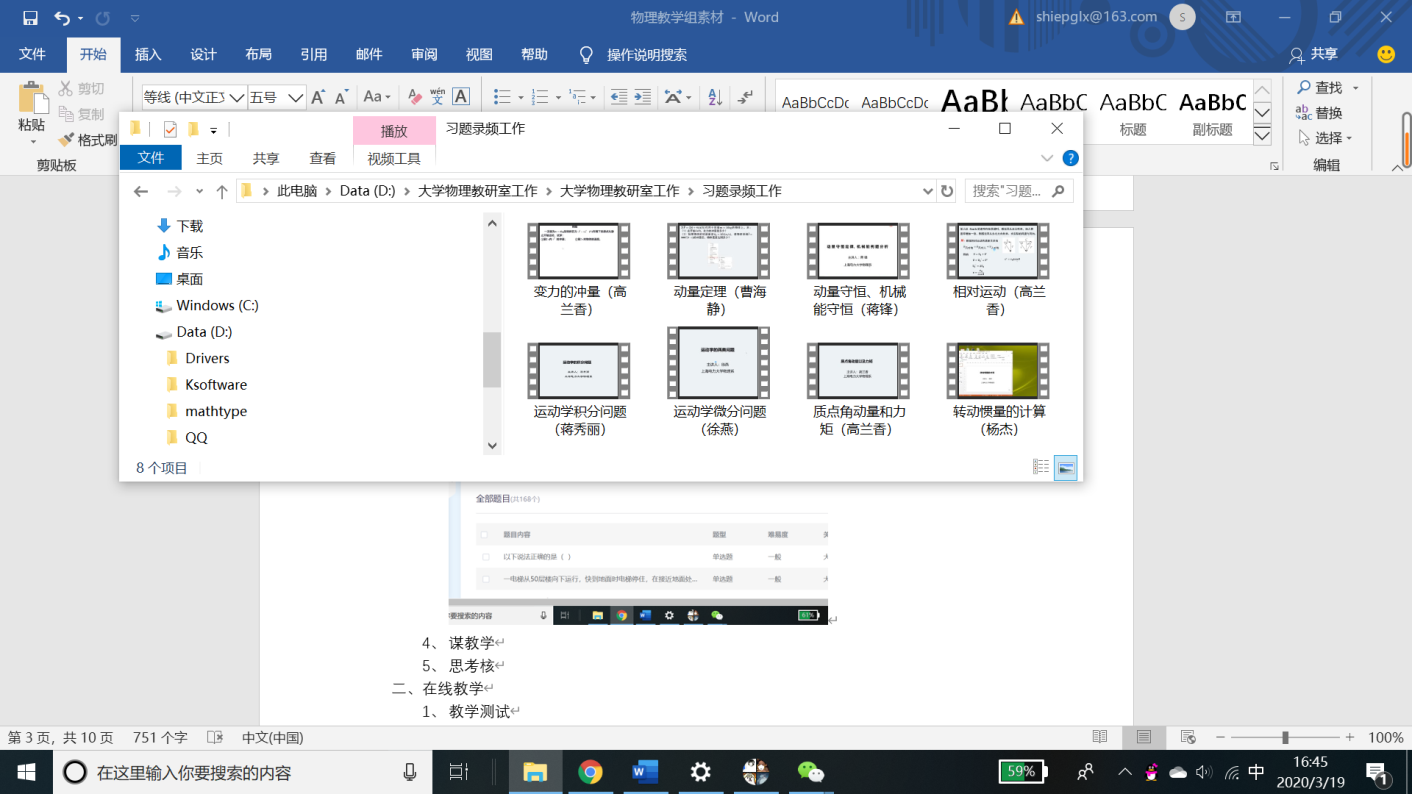 完善线上资源库。员工线下学习效果如何?如何进行高质量的线上教学互动?线上线下如何有效衔接?党员教师从在线教学的内涵,实施方式方法等出发,完善课程线上资源库,包括在线题库建设、习题录屏、课件、知识点教学视频等等。支部书记分解任务,带头认领,党员做表率,辐射教学团队。支部党员郑莉、杨杰同志,积极认领习题资源库建设任务,并按期完成;蒋锋、高湉等同志积极开展习题录屏工作;在全体党员积极参与下,在线教学资源建设进展顺利。就《大学物理》而言,现阶段,在线题库习题近200题,用于课堂检测、阶段检测,起到很好的知识巩固效果;共录制40多道习题讲解,20多个知识点讲解视频,更好地充实了学习资源。