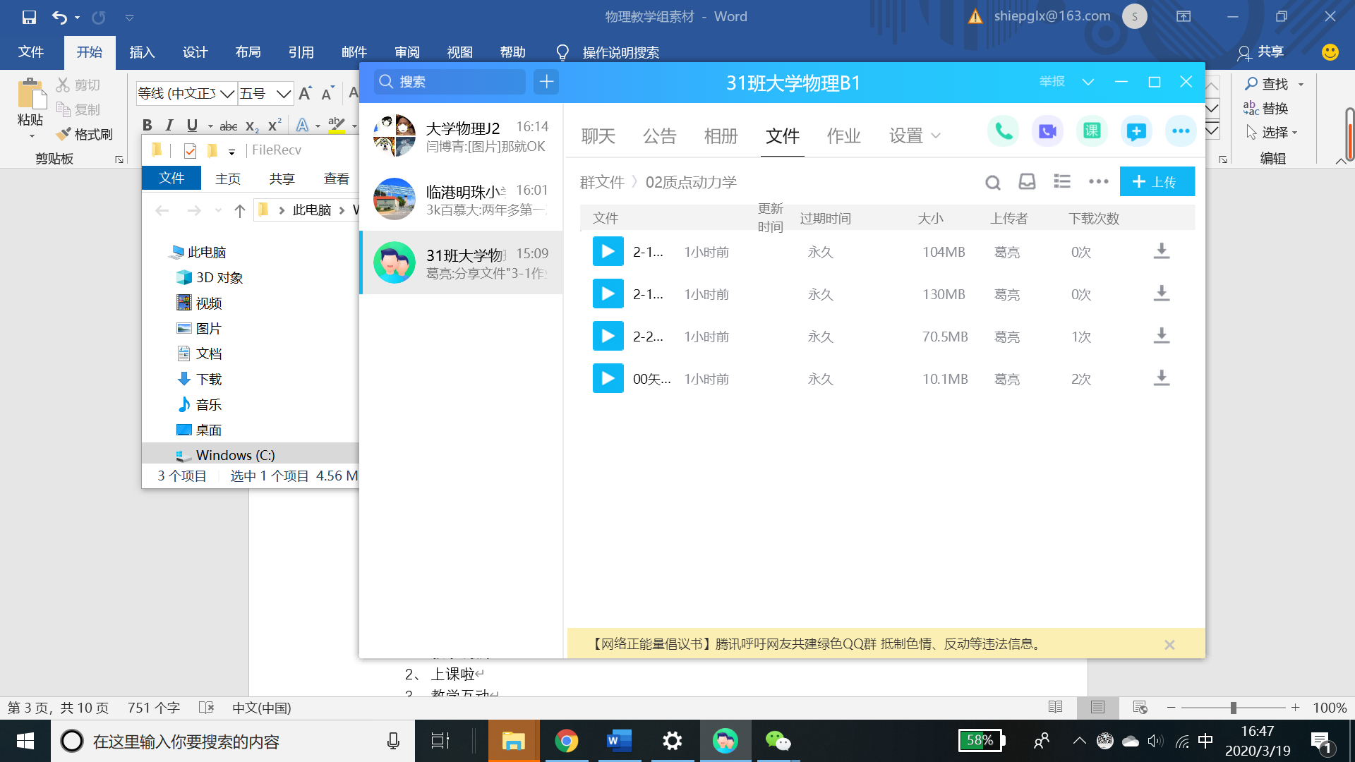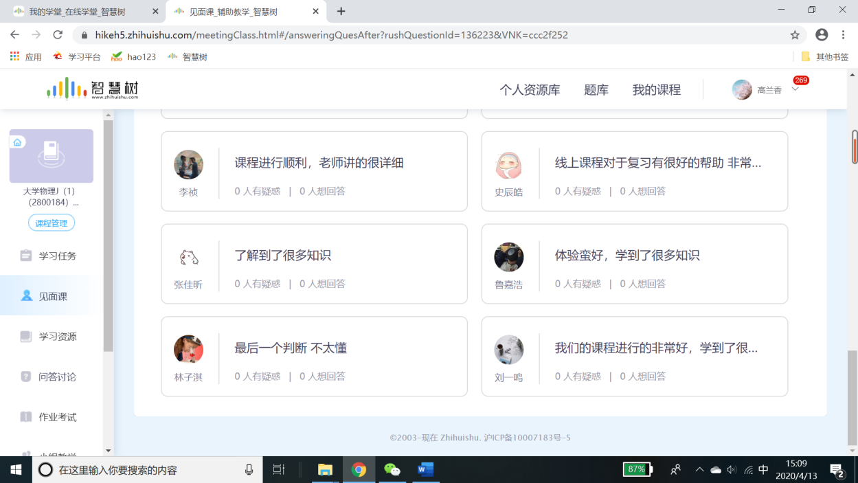 杨孔明同学:网课已经上了一个月,这特殊的一个月以来,感受颇深,也收获了很多。对于大学物理这门熟悉而又新鲜的课程,老师在网上授课的时候细讲定理,详举经典例子,课堂上有条不紊的教学,兼顾答疑解惑互动交流,课后精心布置和批改作业,让我在新鲜的学习中找到了熟悉的感觉。疫情虽在,但我们斗志不减,中国加油,感谢祖国,感谢公司,感谢老师和同学!