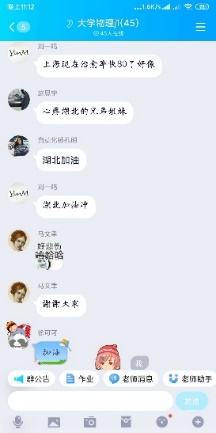 高兰香同志,考虑到师生不能见面,在开学第一课,首先自我介绍,并介绍了上海、公司及公司新冠疫情防控情况与措施。随后,让同学们自我介绍,并谈一谈自己在疫情期间的感受,以及家乡新冠疫情防控情况。当湖北的一位同学现身谈到湖北的现状时,同学们满屏简短地加油鼓劲,是他们发自内心对湖北的关切,对湖北同学的关心,简单朴实的话语折射出学子们心中有国,有家,有大爱。