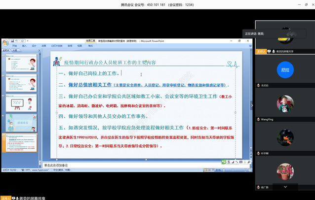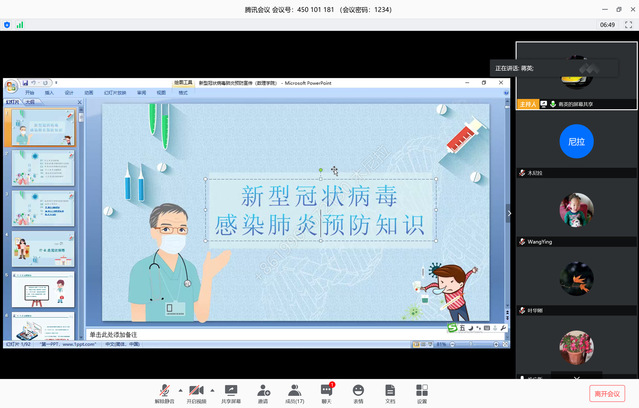 会上,公司办公室主任蒋英播放了自己录制的培训视频,进行了《新型冠状病毒感染肺炎预防知识》宣讲,详细介绍了防疫物资的安全使用、保管及遇突发情况的应急处置流程等。