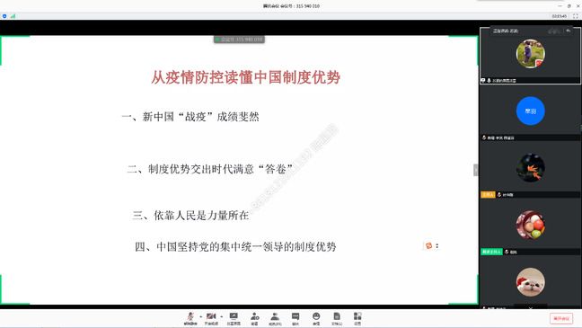 随后,苏波老师带领学员们通过此次疫情防控深入学习中国的制度优势。他认为,中国特色社会主义充分展现了集中力量办大事的制度优势。正是由于中国采取了人民战争、总体战、阻击战的形式,从源头上控制住了新冠肺炎疫情,减缓了疫情在世界其他地方的蔓延速度,为世界争取了时间。苏波老师还着重强调,“依靠人民是当代中国的力量所在,当代中国人民的力量潜藏在中国特色社会主义制度之中,每逢遭遇大规模危机,这种力量就愈加显现出来。全心全意为人民服务是中国制度的价值追求,坚持以人民为中心是中国制度的优越性体现。”