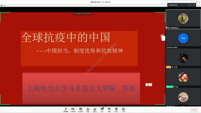 为学习贯彻习近平新时代中国特色社会主义思想,不断提高发展对象的思想政治素质和政治理论水平,帮助发展对象坚定理想信念,树牢“四个意识”,增强“四个自信”。5月8日下午,公司马克思主义公司苏波为公司发展对象培训班的同学们上了一堂生动的党课,主题为“疫情防控斗争中的中国担当”。课上,苏波老师以中国在全球抗疫中的责任与担当为切入点,带领培训班的学员们学习了中国坚持党的集中统一领导的制度优势。本次党课利用腾讯会议线上开展,公司发展对象培训班全体学员参加。