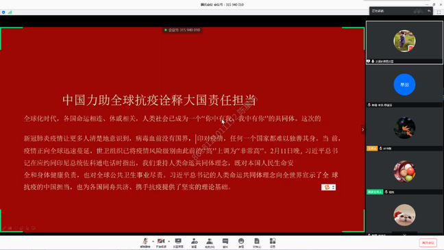 首先,苏波老师向学员们介绍了中国在此次全球抗疫中是如何诠释大国的责任与担当的。苏波老师介绍到,当前新冠肺炎疫情在全球持续蔓延,面对疫情,中国在采取果断措施抗击疫情的同时不忘伸出援手,向其他国家提供力所能及的帮助,展现了负责任的大国形象。习近平总书记的人类命运共同体理念向世界宣布了全球抗疫的中国担当,也为各国同舟共济、携手抗疫提供了坚实的理论基础。正如2月11日晚习近平总书记在应约同印尼总统佐科通电话时指出,“我们秉持人类命运共同体理念,既对本国人民生命安全和身体健康负责,也对全球公共卫生事业尽责。”