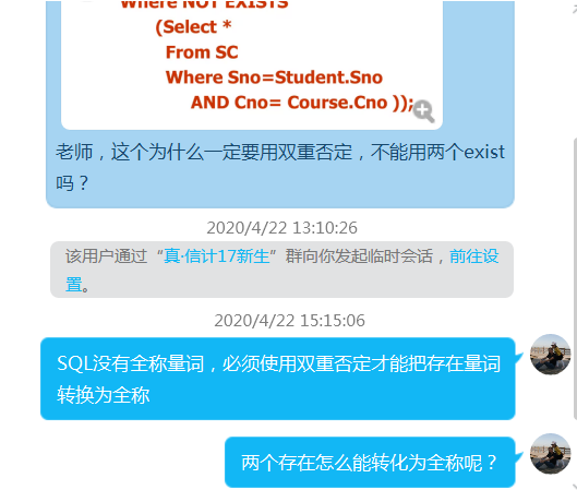 为了让员工能够保质保量的完成学习任务,冯莉老师根据不同课程的实际情况,选择不同的教学平台。比如数据库原理课程,由于MOOC视频内容相对较少,冯莉老师采用腾讯课堂直播讲解的方式开展理论教学,利用腾讯课堂的回放功能,可以保证同学们在课上听不懂的地方能够及时回看。需要上机实验的时候,则采用腾讯会议的方式开展,利用腾讯会议每一位参与者均可以分享屏幕的功能,能够更好在同学们出现问题时答疑解惑。同时结合课程QQ群,同学们可以分享问题截屏,老师在线解答,实时沟通。