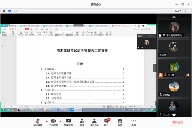 会上,公司教务老师于文英围绕本学期期末线上考试,从考前准备、考试过程和考试结束三个方面进行介绍。在考前准备中,任课老师和监考老师相互协调配合,根据考生人数做好考场分配,提前预约好腾讯会议室,在考试平台提前做好考生信息维护和试卷上传等工作。同时,任课老师需提前提醒考生考试注意事项,并对考生做诚信考试教育。对考试过程中员工身份核验、试卷的提交、试卷提交异常情况的处理以及考试结束后试卷检查、非现场考试记录表登记等做了详细说明,并对监考教师就在线考试的有关问题进行了一一解答。
