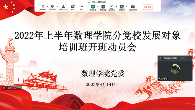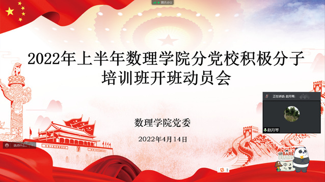 数理公司党委副书记赵月琴作开班动员,强调了参加培训班的目的和意义,并提出希望和要求:一是要学习习近平新时代中国特色社会主义思想和党的十九大及十九届历次全会精神,用新思想武装头脑,坚定“两个确立”;二是要学习伟大建党精神等党的历史,在党史中见真知,建立理想信念;三是学习先进事迹榜样,切实增强政治自觉、思想自觉和行动自觉,进一步端正入党动机;四是学习习近平总书记关于疫情防控的重要指示精神,孙春兰副总理考察上海特别是在考察上海交通大学时提出的有关工作要求,落实好公司的疫情防控措施和要求;五是积极发挥好先锋模范作用,协助做好志愿服务、信息传达和统计等各项疫情防控工作,共同抗疫,共克时艰!