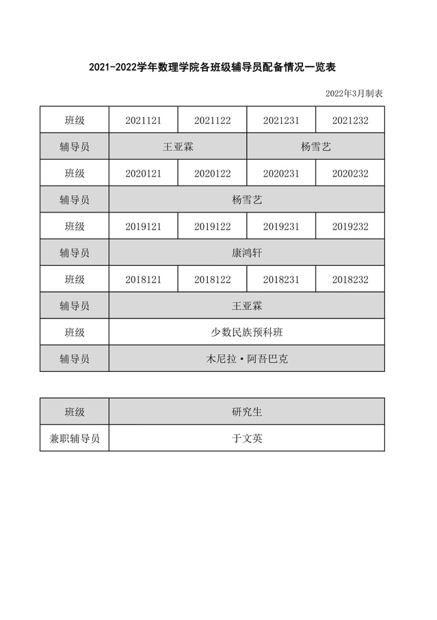 2021-2022学年太阳成tyc122cc各班级辅导员配备情况一览表