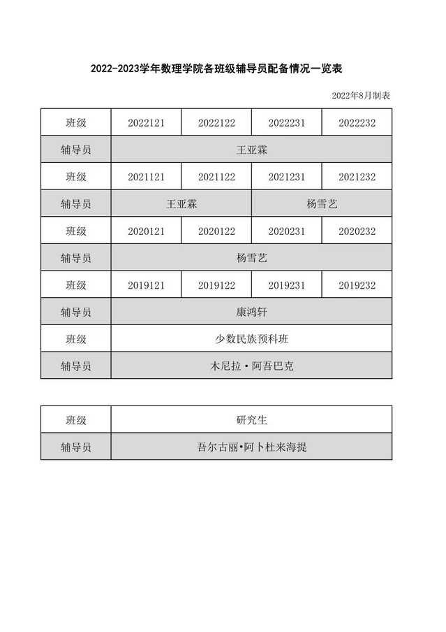 2022-2023学年太阳成tyc122cc各班级辅导员配备情况一览表