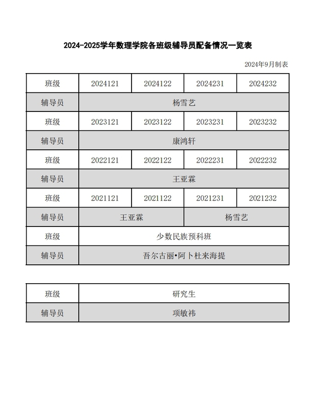 2024-2025学年太阳成tyc122cc各班级辅导员配备情况一览表